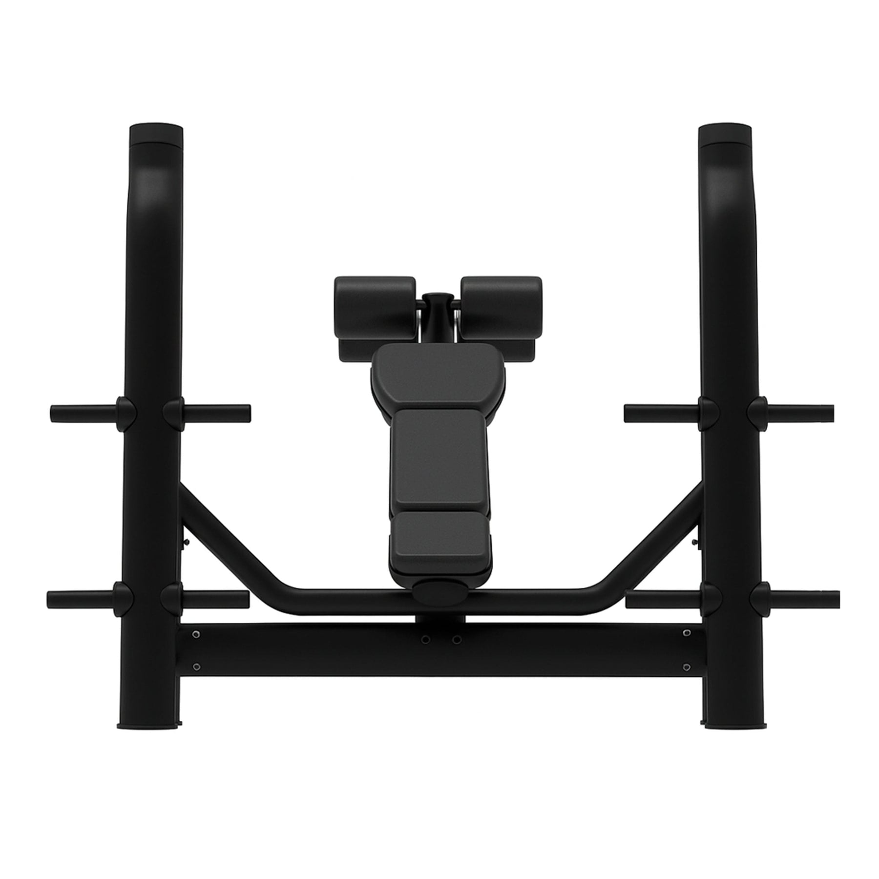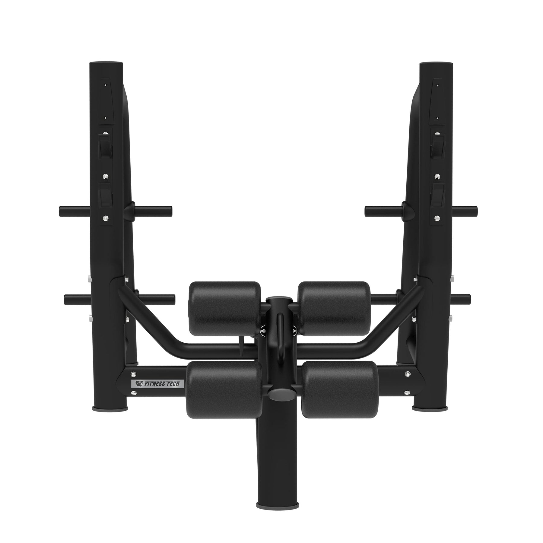 El respaldo declinado y el soporte para piernas con rodillos acolchados permiten mantener una posición firme durante todo el movimiento, favoreciendo una técnica segura y cómoda. Los soportes para barra, situados a diferentes alturas, facilitan el despegue y reenganche del peso con total confianza, mientras que las salidas laterales para discos permiten tener el área de trabajo siempre organizada.