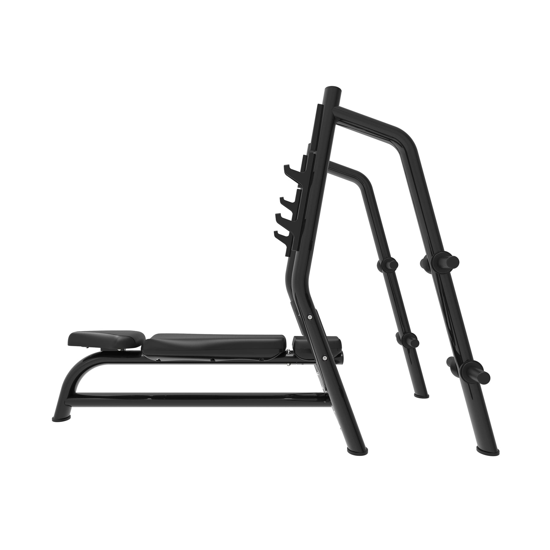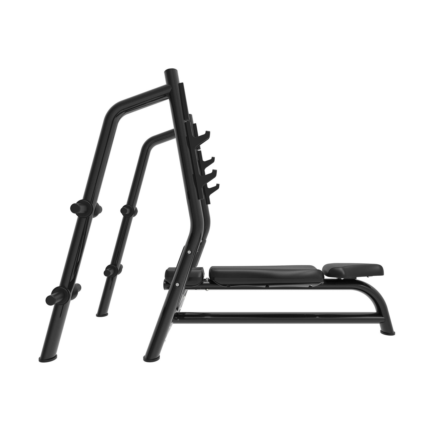 El banco cuenta con una superficie completamente plana y un acolchado de alta densidad que proporciona firmeza y confort, permitiendo mantener una postura técnica y estable durante todo el movimiento. Los soportes de la barra, dispuestos a diferentes alturas, facilitan un despegue cómodo y un reenganche seguro, adaptándose al tipo de entrenamiento o a la estatura del usuario. La zona delantera abierta permite la asistencia de un spotter, haciendo que los entrenamientos intensivos sean más seguros y eficaces.
