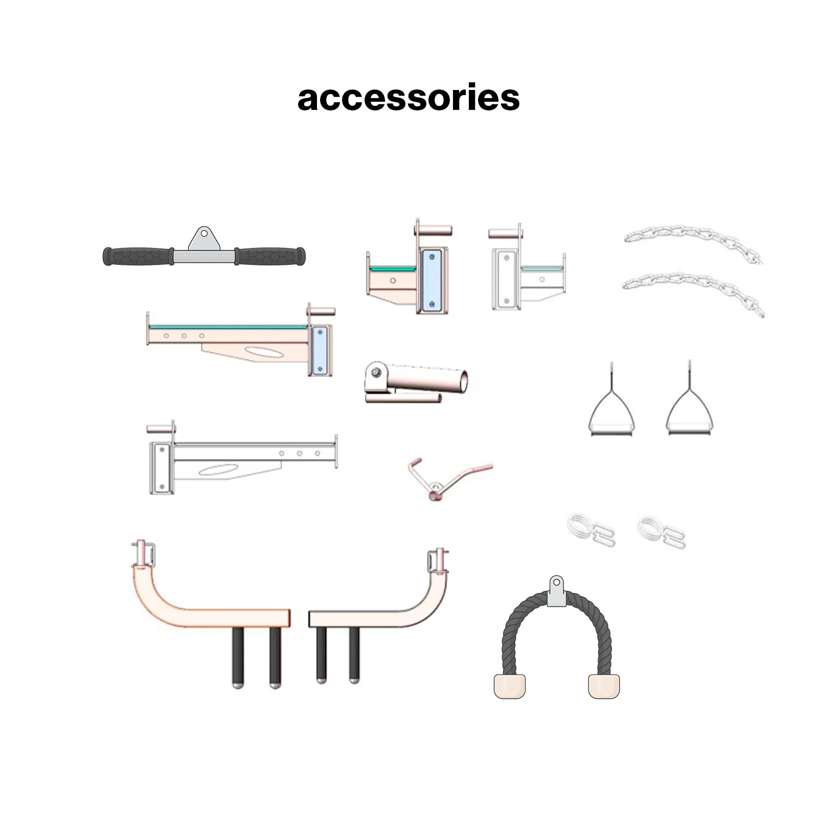 Wszystkie akcesoria pokazane na zdjęciach są wliczone w cenę. Obejmuje chwyt prosty, chwyt prosty na triceps i chwyt olimpijski, a także wykonywanie ćwiczeń wioślarskich.